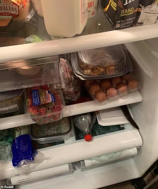 Un usuario de Reddit publicó una foto de su refrigerador en el hilo popular. encontrarelfrancotiradorafirmando que casi cerraron la puerta y atraparon a su gato en un ambiente fresco después de que el animal logró colarse adentro.