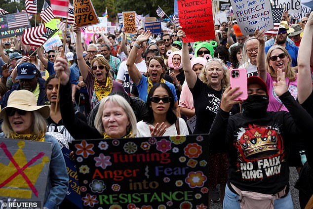 Los baby boomers blancos dominan la multitud en un mitin “No Kings” en Atlanta, Georgia, el sábado.