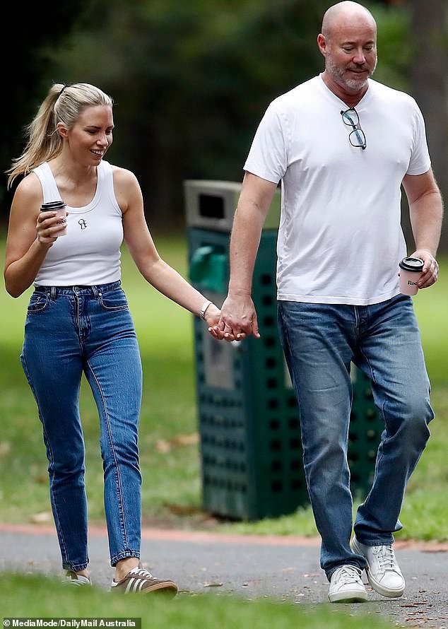 La pareja parecía acogedora mientras paseaban por un parque cerca del apartamento multimillonario de Sayers en East Melbourne, acompañados por su hija Claudia y un perro de la familia.