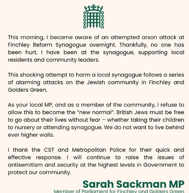 Sarah Sackman, diputada de Finchley y Golders Green, describió el incidente de anoche como “impactante” y añadió que la comunidad judía debería ser “libre de ocuparse de sus asuntos sin miedo”.