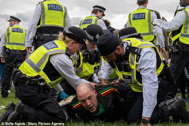 Un hombre derribado al suelo por agentes de policía en Hyde Park mientras los amantes del cannabis se reúnen para celebrar el 420