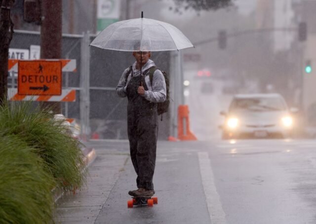 Un peatón camina bajo la lluvia en el centro de Palo Alto mientras llega una tormenta al Área de la Bahía el lunes 13 de octubre de 2025. (Dai Sugano/Bay Area News Group)