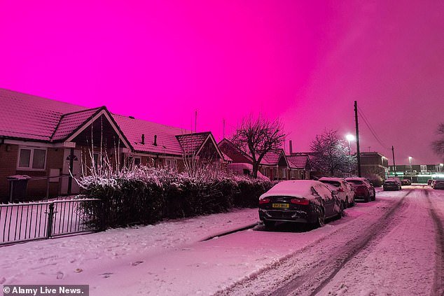 El cielo se vuelve rosa durante las nevadas en el área de Small Heath en Birmingham esta mañana temprano