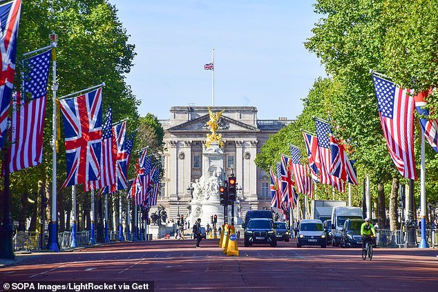 Las banderas de las banderas y los sindicatos de las banderas de Union Jacks decoran el centro comercial que conduce al Palacio de Buckingham antes de la visita de estado de Donald Trump el mes pasado
