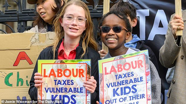 Las escuelas privadas se están preparando para un año “aún peor” en 2026 debido a una “crisis cada vez más profunda” causada por el IVA laborista sobre las tasas de matrícula, dicen los expertos (en la foto: niños protestando contra la política el año pasado)