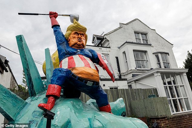 Esta tarde arderá en la ciudad de Sussex una enorme efigie de Donald Trump, creada por la Southover Bonfire Society y que representa al presidente de los Estados Unidos como el Capitán América de pie sobre una Estatua de la Libertad decapitada.