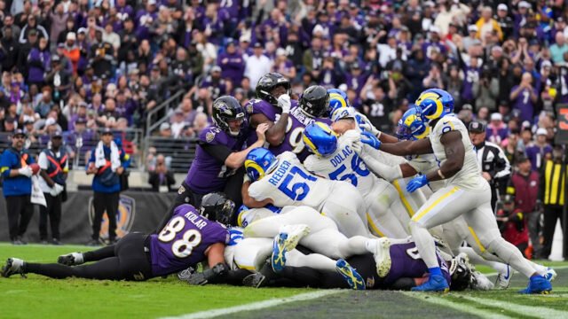 Los Baltimore Ravens tuvieron dos oportunidades en la línea de gol el domingo contra Los Angeles Rams. Fueron bloqueados en ambas ocasiones y tuvieron suerte de no perder el balón para un touchdown defensivo de los Rams.