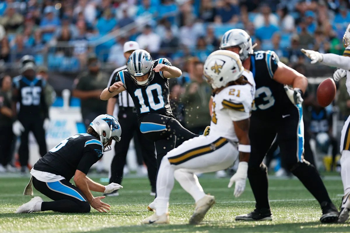 Los New Orleans Saints bloquearon un intento de gol de campo del pateador de los Carolina Panthers, Ryan Fitzgerald, el domingo. Pero los Panthers pudieron recuperar la posesión en la jugada y ganar otra serie de oportunidades.