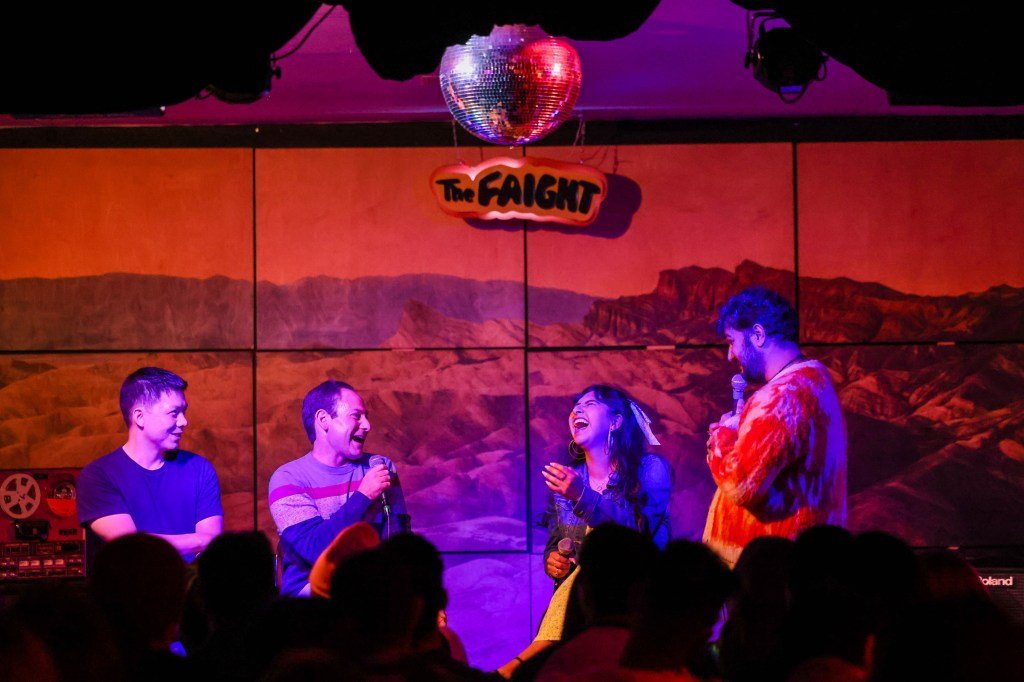 En un bar en un sótano con poca luz en el barrio Haight de San Francisco, docenas de solteros con el pelo peinado hacia atrás y bebidas elegantemente vestidas sostienen cócteles en vasos de plástico sudorosos. Charlan, socializan y participan en una producción presentada como una “comedia de citas”.