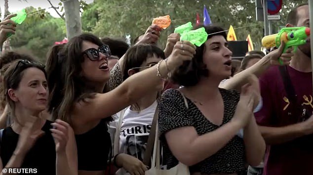 Los turistas evitan algunas partes de España porque temen ser “disparados” por fanáticos antiturísticos, advirtió el jefe de una agencia de viajes. En la foto: Manifestantes en Barcelona arrojaron pistolas de agua a los turistas que comían en lugares populares de la ciudad a principios de este año.