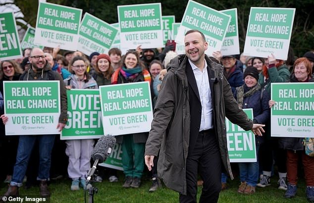 Los Verdes fueron acusados ​​el domingo de elegir candidatos en las elecciones locales que se jactaban de “compasión” a pesar de promover abiertamente teorías de conspiración antisemitas “aborrecibles”. En la foto: el líder del Partido Verde, Zack Polanski, asistió a un evento de campaña en Gorton y Denton en febrero.