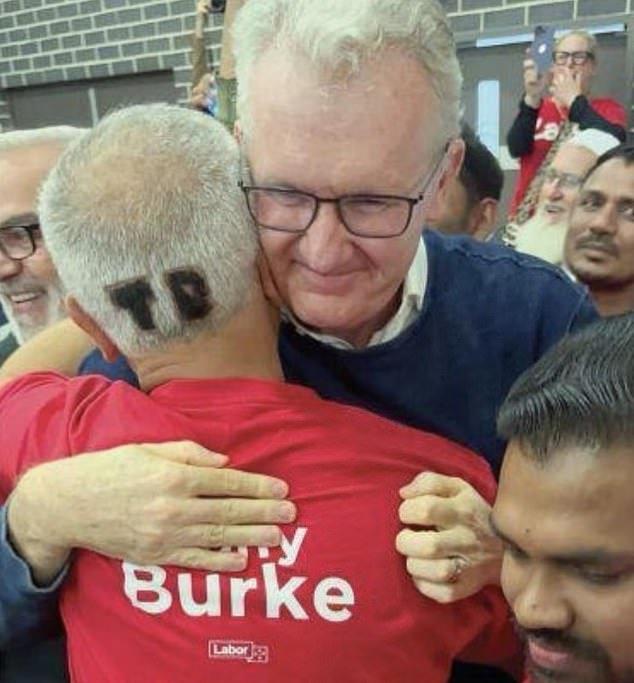 Se muestra a Tony Burke besando al Dr. Jamal Rifi, quien tiene las iniciales de Burke teñidas en el cabello en una celebración de las elecciones de 2025.