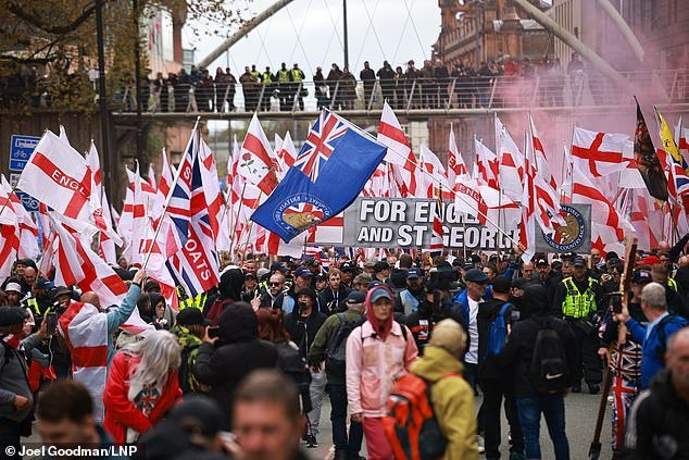 Cientos de agentes estuvieron presentes en la protesta después de que la Policía del Gran Manchester (GMP) fuera acusada de “perder el control” cuando se produjo violencia durante una “Marcha de Inmigración” anterior desde Gran Bretaña en febrero.