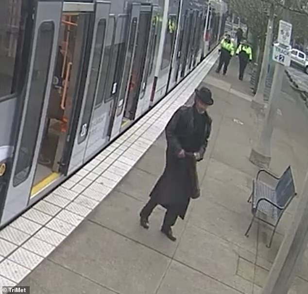 En el clip, se ve a Edwards desembarcando de un tren ligero MAX vistiendo una gabardina negra larga antes de aparentemente intentar volver a abordar en el último minuto cuando las puertas se cerraban.