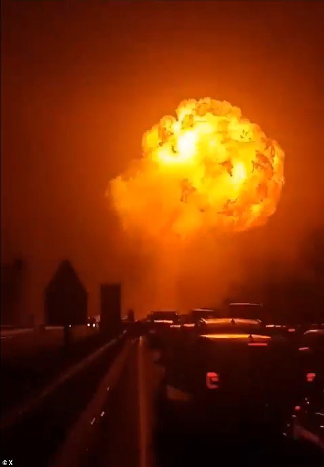 El vídeo muestra un destello de color naranja brillante que ilumina el cielo nocturno sobre el tráfico en cola mientras un fuerte estallido resuena en el área de servicio de Teano en la provincia italiana de Caserta.