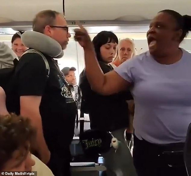 La pasajera autorizada (derecha) gritó a la multitud ansiosa por bajar del avión cuando ella se negó a moverse.
