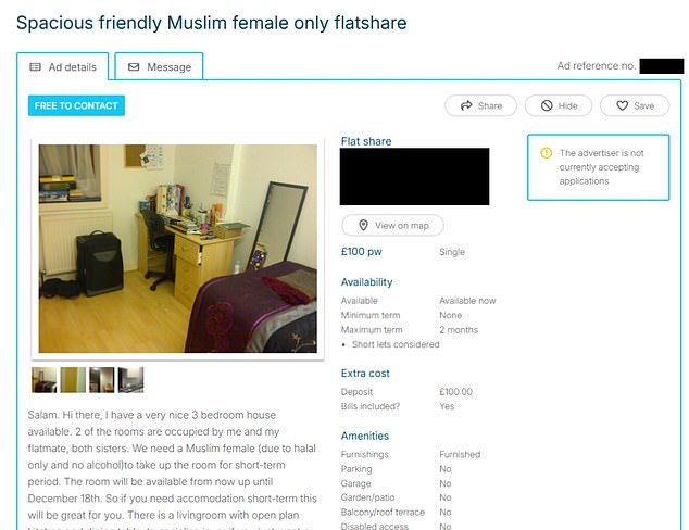 El anuncio de la habitación, que figura en SpareRoom para inquilinos por £ 600 al mes, incluidas las facturas de servicios públicos, la describe como un “hogar musulmán, sin comida, alcohol, etc. no halal”. “.
