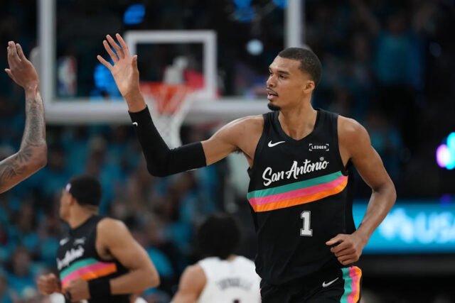 Wembanyama y los San Antonio Spurs obtuvieron una dominante victoria por 111-98 sobre los Portland Trail Blazers para iniciar su carrera en los playoffs. Tuvo 35 puntos y cinco rebotes para impulsar al equipo a la victoria en el Frost Bank Center, que estaba lleno de fanáticos de los Spurs vestidos con camisetas de playoffs con el tema de Fiesta que satisficieron con creces el momento, considerando que era el primer juego de playoffs del equipo desde 2019.