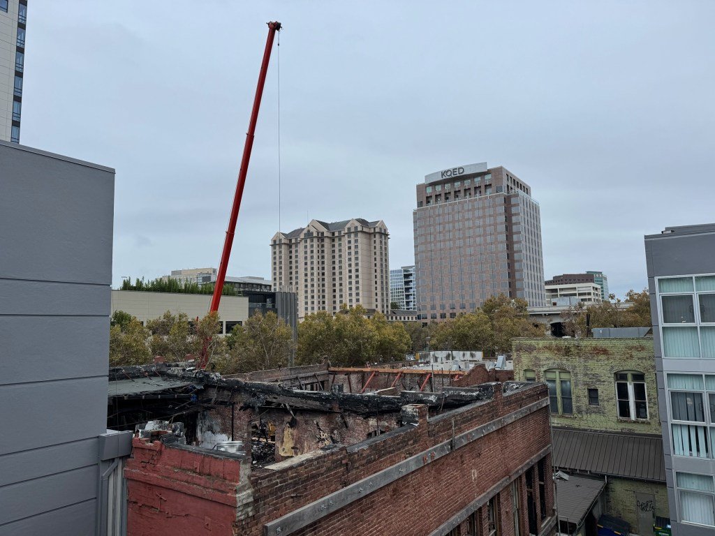 Una grúa opera en el segundo piso lleno de escombros del Hotel Lawrence, ubicado entre 69 y 87 East San Fernando Street en el centro de San José, visto el 15 de octubre de 2025. (Robert Summa/Bay Area News Group)