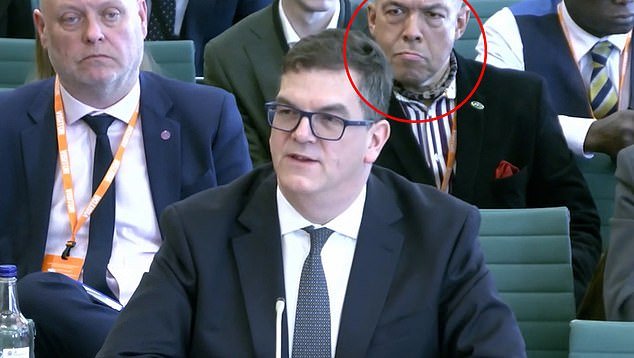 Andrew Edwards (derecha) causó una impresión duradera en la audiencia de Sir Olly Robbins (centro) el martes debido a su peculiar vestido que incluía corbata y pañuelo en el bolsillo.