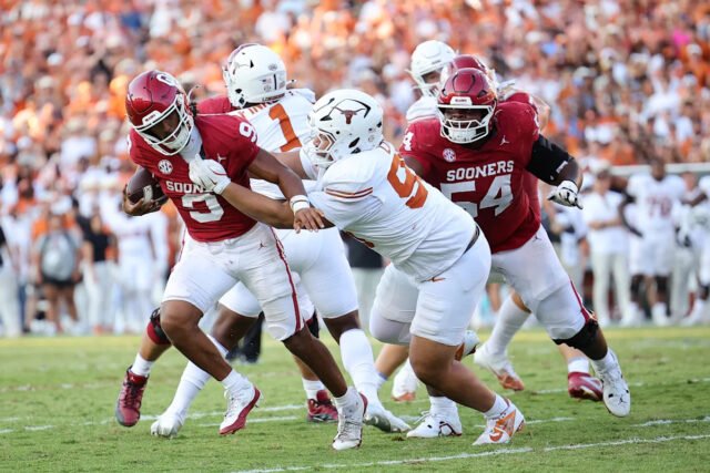– Y en 2023, Texas alcanzó el tercer lugar en la clasificación después de algunas victorias impresionantes, especialmente en la carretera en Alabama. Aunque Texas emergería como el equipo mucho mejor a medida que avanzaba la temporada, Oklahoma finalmente los sorprendió con el mariscal de campo Dillon Gabriel enhebrando la aguja para un touchdown y una victoria 34-30 con 15 segundos restantes.