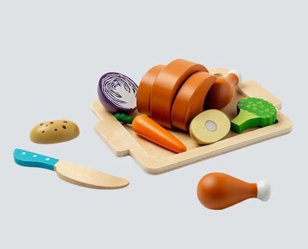 El juguete de cocina incluye una pequeña bandeja de madera, un cuchillo y una variedad de alimentos de madera utilizados en una clásica cena asada, como zanahorias, patatas, muslos de pollo, repollo y brócoli.