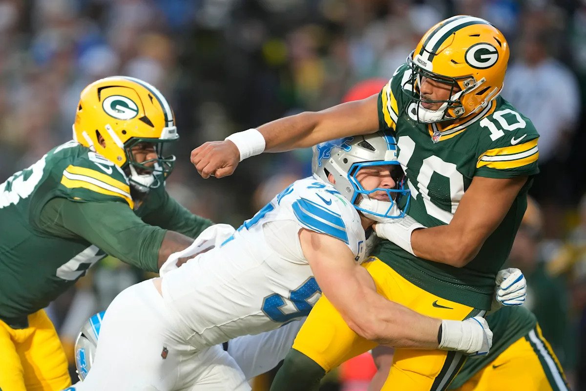 Aidan Hutchinson de los Detroit Lions golpea al mariscal de campo de los Packers, Jordan Love, durante una reunión de la Semana 1 entre los equipos. (Foto de Patrick McDermott/Getty Images)