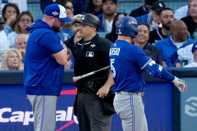 El manager de los Toronto Blue Jays, John Schneider, disputó una decisión con el árbitro del plato Mark Wegner temprano en el Juego 3 de la Serie Mundial el lunes por la noche en Los Ángeles. (AP/David J. Phillip)