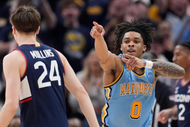 “Marquette derrota a UConn 66-62 en el final de la temporada regular”. Nigel James Jr. de Marquette abrió el camino para los Golden Eagles con 19 puntos, 7 asistencias y 2 rebotes con 7-19 tiros de campo. La defensa de UConn se lo puso difícil a James, con el escolta novato con marca de 1-7 desde detrás del arco y perdiendo seis pérdidas de balón.