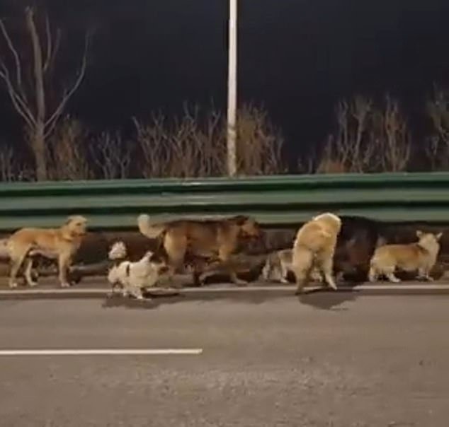 Imágenes virales muestran a los animales, de todos los tamaños, formando una “banda de hermanos” y trotando por una transitada carretera en Changchun, provincia de Jilin.