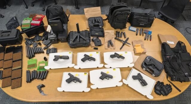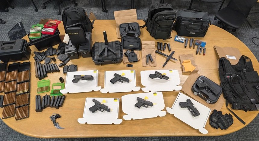 El martes, los detectives encontraron al hombre en San Bruno y lo arrestaron bajo sospecha de agresión con arma de fuego. Llevaba un arma de fuego cargada, dijo la policía, y añadió que tras la ejecución de la orden de registro por parte de los detectives se incautaron un total de cinco armas de fuego, dos réplicas de armas de fuego, varios cargadores de alta capacidad y 1.500 cartuchos de munición.