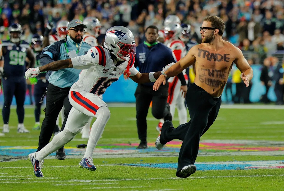 En el último cuarto del enfrentamiento de los Patriots contra los Seattle Seahawks, un aficionado sin camiseta corrió hacia el campo y eludió la seguridad lo suficiente como para llegar al campo abierto del Levi’s Stadium. Normalmente, los jugadores simplemente ignoran a los invasores en el campo a menos que la persona entre en su espacio personal.