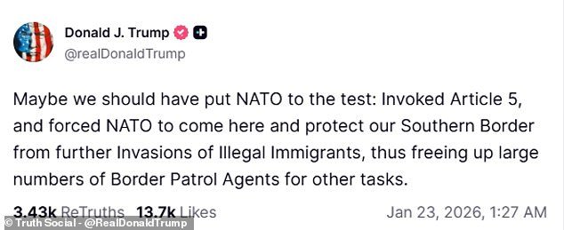 En un artículo de Truth Social publicado el jueves por la noche, Trump escribió: “Quizás deberíamos haber puesto a prueba a la OTAN: invocar el Artículo 5 y obligar a la OTAN a venir aquí y proteger nuestra frontera sur de futuras invasiones de inmigrantes ilegales, liberando a un gran número de agentes de la Patrulla Fronteriza para otras tareas”.