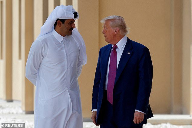 El presidente de los Estados Unidos, Donald Trump, habla con el emir de Qatar Tamim bin Hamad Al Thani en Doha, Qatar, 15 de mayo de 2025