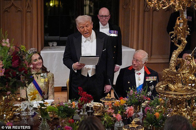 El presidente Donald Trump elogió ‘radiante’ y ‘saludable’ a la princesa Kate mientras se entregaba un regalo el miércoles por la noche al rey Charles en un lujoso banquete estatal en el Castillo de Windsor.