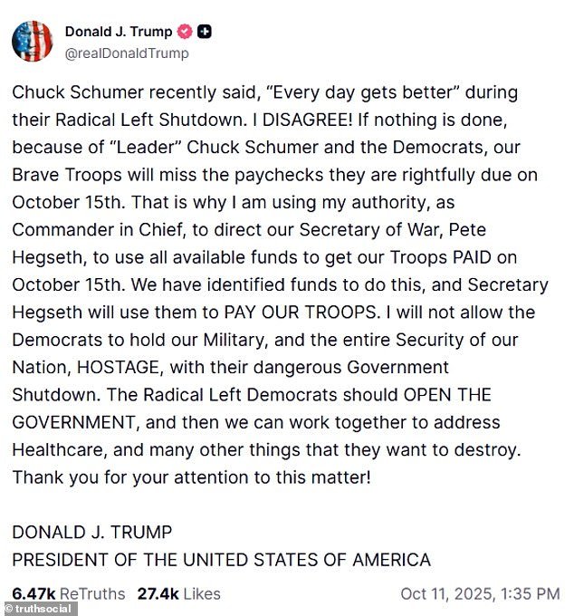 Donald Trump dijo el sábado que le pidió al secretario de Guerra, Pete Hegseth, que utilice “todos los fondos disponibles” para garantizar que las tropas estadounidenses reciban su pago antes del 15 de octubre, a pesar del actual cierre del gobierno por parte de la “izquierda radical”.