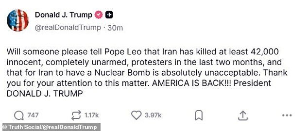 “¿Puede alguien decirle al Papa Leo que Irán ha matado al menos a 42.000 manifestantes inocentes y completamente desarmados en los últimos dos meses, y que el hecho de que Irán tenga una bomba nuclear es absolutamente inaceptable”, escribió el presidente en su página Truth Social.
