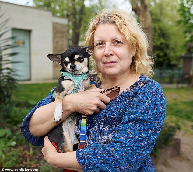 Camilla, de 67 años, aquí con Harry, el Bedlington terrier, cree que todo esto es normal en el cementerio de Brompton.