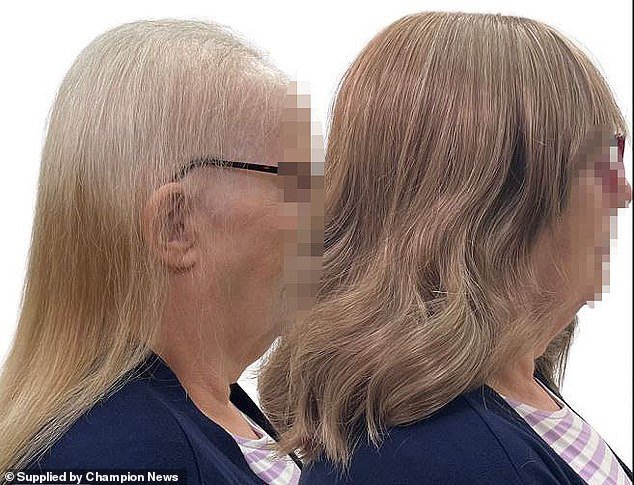 El color del cabello de la peluca coincide y se coloca para cubrir las zonas calvas, con el cabello restante “pasado a través de la malla con una aguja de gancho” para que quede junto al cabello de la peluca.