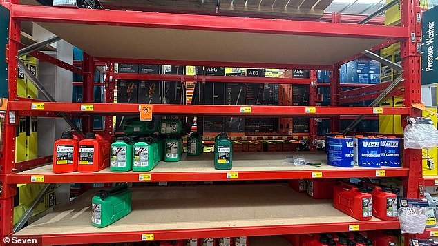 Algunos han llegado incluso a acumular combustible comprando bidones y llenándolos en las gasolineras; una fotografía muestra un estante casi vacío en Bunnings.