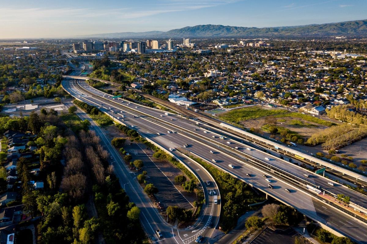 Vista aérea de Silicon Valley en California con una autopista de varios carriles que conduce al horizonte de la ciudad y montañas en la distancia.