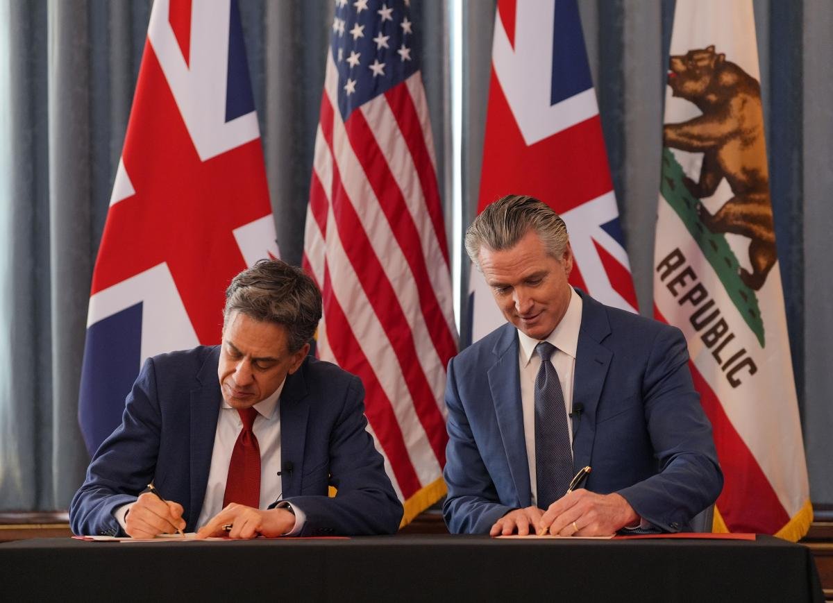 El secretario británico de Seguridad Energética y Net Zero, Ed Miliband (izquierda), y el gobernador del estado de California, Gavin Newsom, se dan la mano después de firmar un acuerdo de energía limpia en el Ministerio de Asuntos Exteriores de Londres. PENSILVANIA.