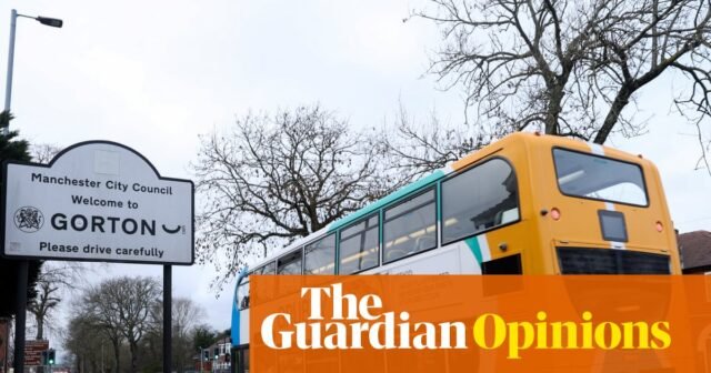 tLa ruta del autobús número 201 comienza en el país de las maravillas regenerado del centro de Manchester y sigue una línea recta a través de los barrios del este. Los nuevos rascacielos de la ciudad y los relucientes hoteles nuevos se desvanecen rápidamente, y en menos de 10 minutos se llega a Gorton, en el límite del distrito electoral que, dentro de poco más de tres semanas, verá las elecciones parciales que podrían tener profundas consecuencias para el futuro del Partido Laborista y la política británica.