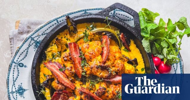 tsu receta, adaptada de una mi libro de cocinaes una forma muy elaborada de servir humilde queso de coliflor. Toda la planta, incluidas las hojas y el corazón, se sazona con nuez moscada y se tuesta, luego se cubre con una satisfactoria capa de rica salsa de queso y se tuesta hasta que se quema y burbujea. Elija una coliflor con muchas hojas, ya que quedan deliciosamente crujientes al asarse.