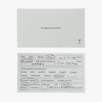 Ella se inspiró en tarjetas de coqueteoque se utilizaban en la época victoriana para pedir una cita a un posible amante. Con frases como “¿Puedo verte en casa?” » y “Deseo ardientemente conocerte”, las cartas Ofrecía a los hombres una forma sigilosa de mostrar interés por las mujeres en público, donde las mujeres a menudo eran acompañado de un guía.