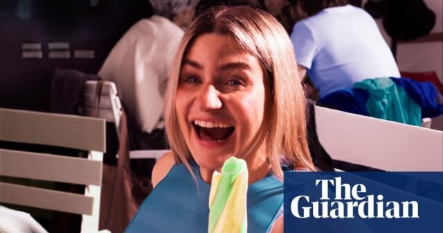 La comediante Harriet Kemsley comiendo helado en 1991 y recreando el look en 2026.