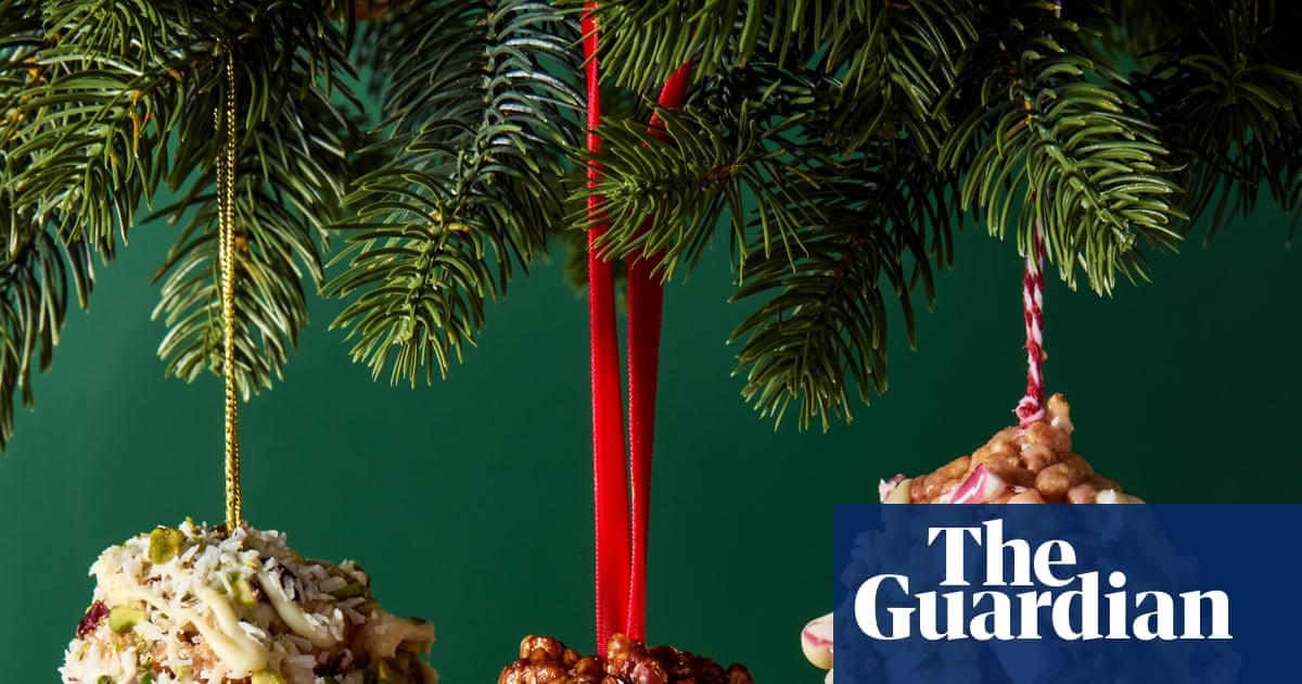 tEstas bolas comestibles son un complemento alegre para la mesa o el árbol de Navidad. Los Rice Krispies, suaves y masticables, recubiertos de malvaviscos, están salpicados de pistachos y arándanos, chocolate y bastones de caramelo de jengibre o menta; Son tan divertidos de hacer como de comer y son un pequeño regalo perfecto. Para agregar cinta para colgar, corte pequeños trozos de cinta, luego haga un bucle y ate los extremos. Empuja suavemente el extremo anudado en la parte superior de cada bola mientras aún esté suave, luego dale nueva forma para que sujete el nudo firmemente mientras se asegura. Alternativamente, envuelve cada bola en celofán, luego júntala en la parte superior y átala con una cinta, dejando un lazo largo para colgar.