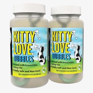 La mayoría de los gatos están ansiosos por perseguir cualquier cosa que se mueva, incluso si desaparece cuando te deslizas sobre él, como una pompa de jabón. Kitty Love Bubbles les da una recompensa por perseguir: dado que el líquido está impregnado de aceite de hierba gatera, los gatos se volverán locos por los residuos que quedan donde estallan las burbujas. Inicialmente, Juno se sintió un poco abrumada por la cantidad de burbujas que tenía que perseguir, pero una vez que se dio cuenta de que podía reventarlas, se fue a la ciudad. Está tan enamorada que viene corriendo al oír que desenrosco la tapa de la botella.