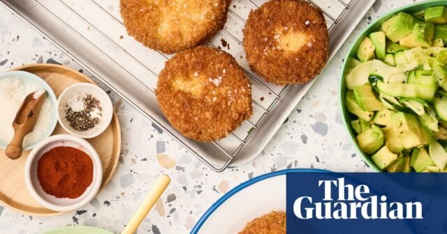 Para desmenuzar, cubra una rodaja de tuétano (o calabacín) con harina sazonada, luego sumérjala en huevo y deje que escurra el exceso, luego cubra con pan rallado panko. Sumerja nuevamente en harina, huevo y panko para obtener el doble de pan rallado, luego colóquelo en la bandeja para hornear. Repita con las rebanadas restantes. Una vez que esté todo cocido, refrigera para que cuaje mientras preparas la salsa y la ensalada.