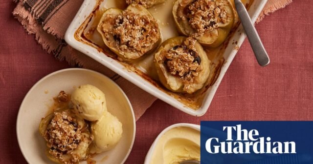 ADespués de los excesos de diciembre, estas manzanas al horno son un pudín vegano ligero y refrescante. El relleno aprovecha todos los frutos secos navideños que quedan, se ilumina con limón y se ata con tahini de avellanas. A medida que las manzanas se cocinan, se vuelven productivas y fragantes, mientras que la avena con sésamo forma una corona dorada. Sirva caliente con un poco de crema, yogur o helado (lácteo o no) y obtendrá una comida reconfortante, saludable y deliciosa.